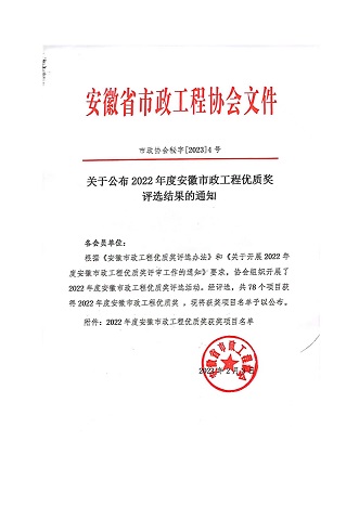 根据《安徽市政工程优质奖评选办法》和《IM网页版登录入口_IM(中国)开展2022年度安徽市政工程优质奖评审工作的通知》要求,安徽省市政工程协会组织开展了2022年度安徽市政工程优质奖评选活动。IM网页版登录入口_IM(中国)承建的黟县五里转盘至开发区段道路及雨污管网升级改造项目荣获2022年度安徽市政工程优质奖。