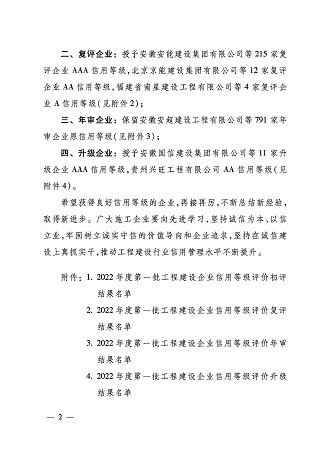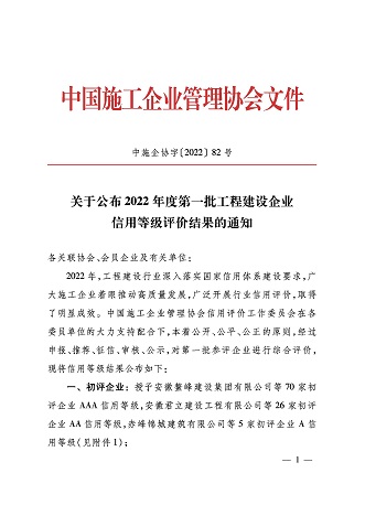 2022年,IM网页版登录入口_IM(中国)再次荣获施工企业最高信用评级“AAA级企业信用证书”。这是对IM网页版登录入口_IM(中国)持续积累的经营管理能力、合同履约能力、市场竞争能力及优质社会形象的权威认证。
