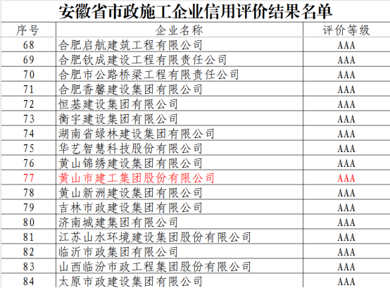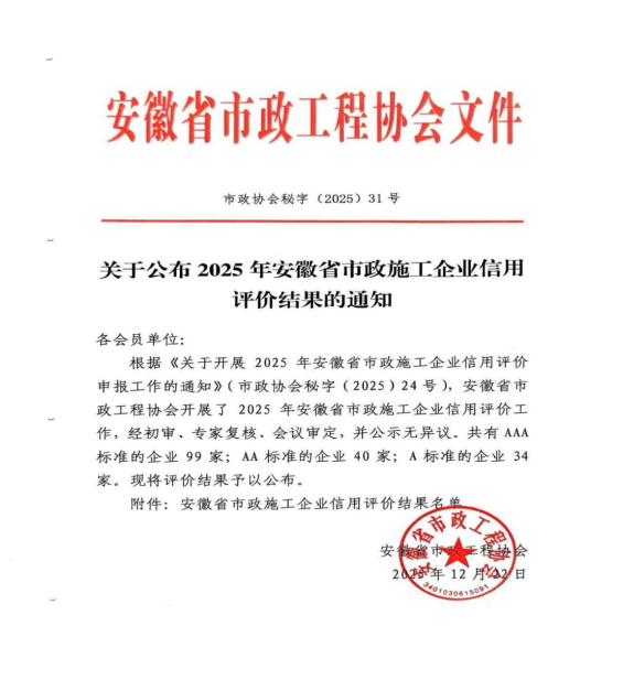 近日,安徽省市政工程协会正式发布《IM网页版登录入口_IM(中国)公布2025年安徽省市政施工企业信用评价结果的通知》。黄山市建工集团凭借卓越的综合实力、规范的市场行为、优良的工程品质及坚实的信用体系建设,成功获评最高信用等级——AAA级。标志着集团在诚信经营、履约能力与社会责任履行方面获得了行业主管部门与协会的高度认可,是企业信用建设领域的又一重要里程碑。