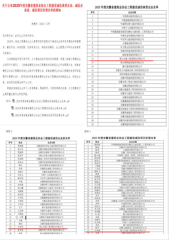 荣誉承载责任,诚信铸就未来。此次系列荣誉的取得,是社会各界及行业权威机构对黄山市建工集团长期坚持“质量第一、信誉至上”经营宗旨的集中肯定。连续保持AAA级信用评级,以及企业家、项目经理多人入选诚信先进名单,不仅提升了IM网页版登录入口_IM(中国)的品牌价值与市场竞争力,也为IM网页版登录入口_IM(中国)在更广阔的市场中赢得了信赖与机遇。